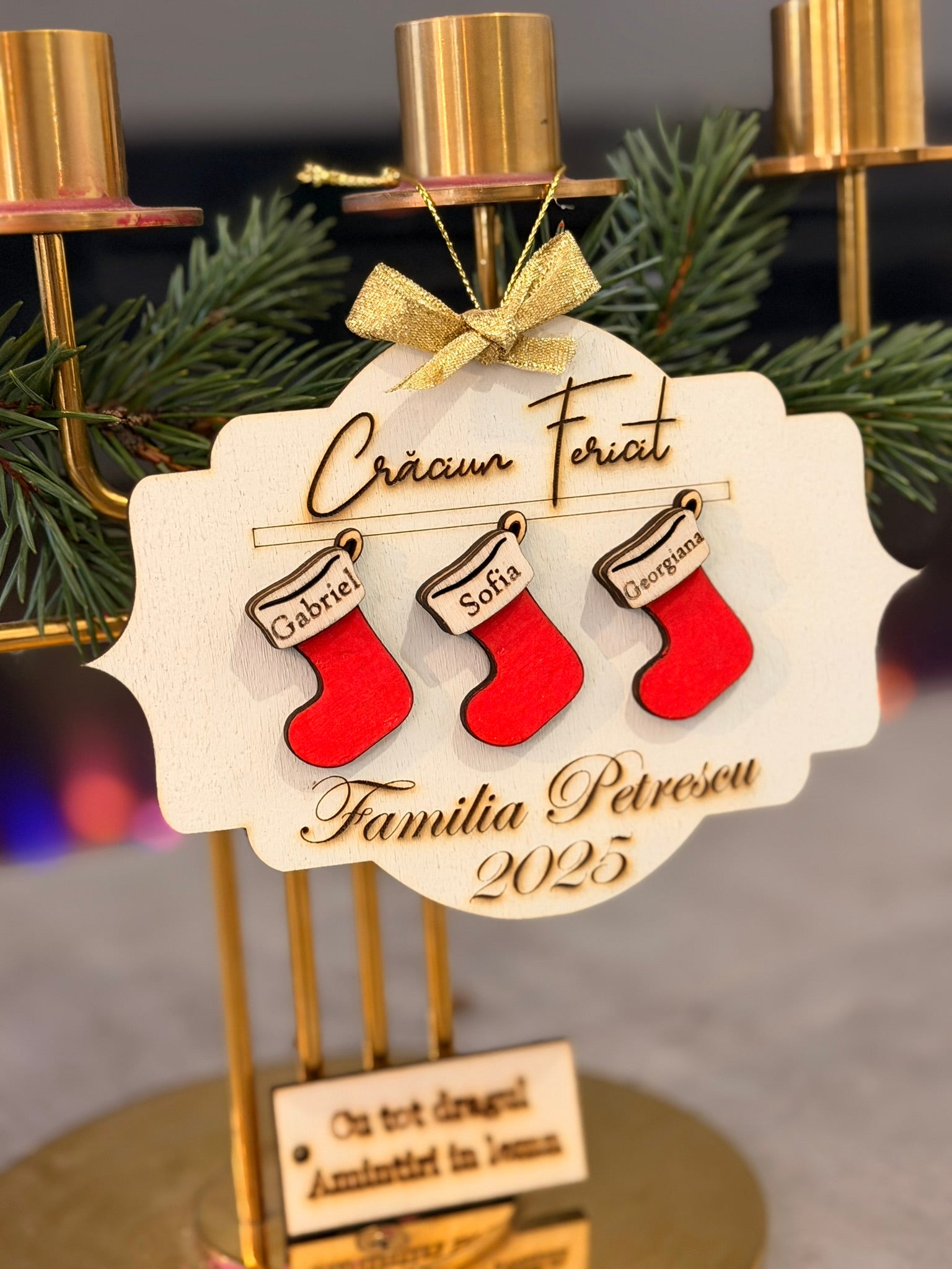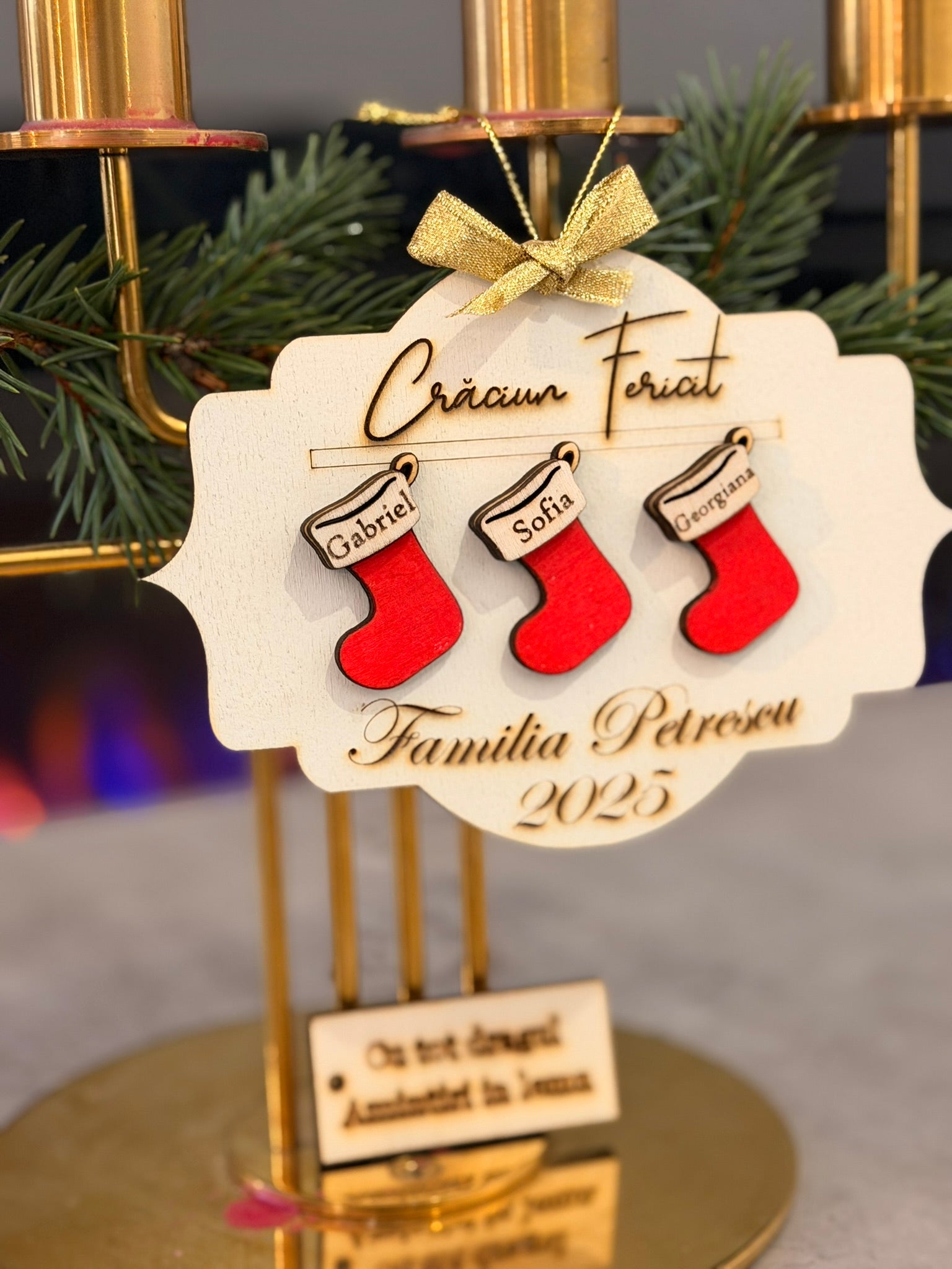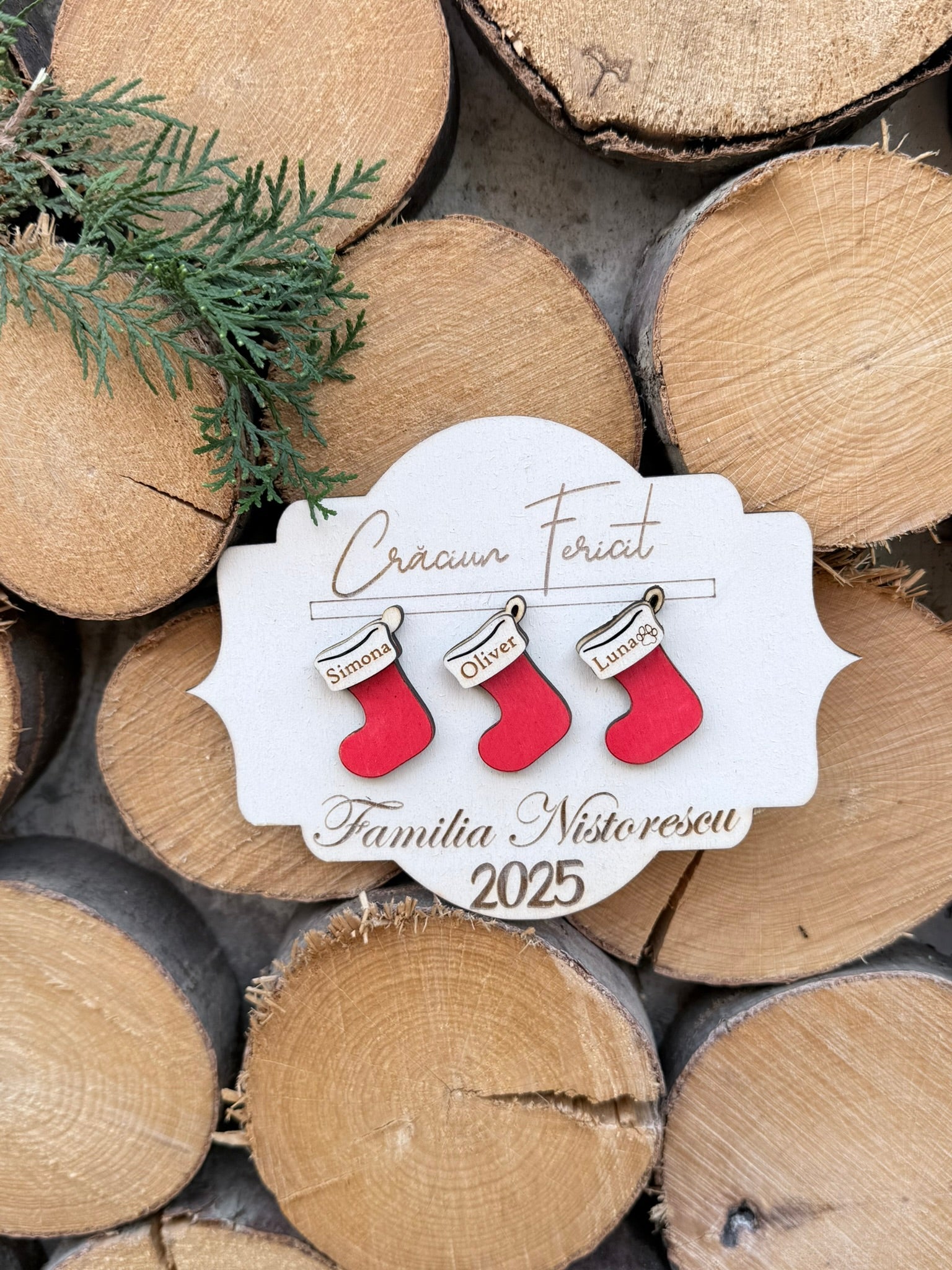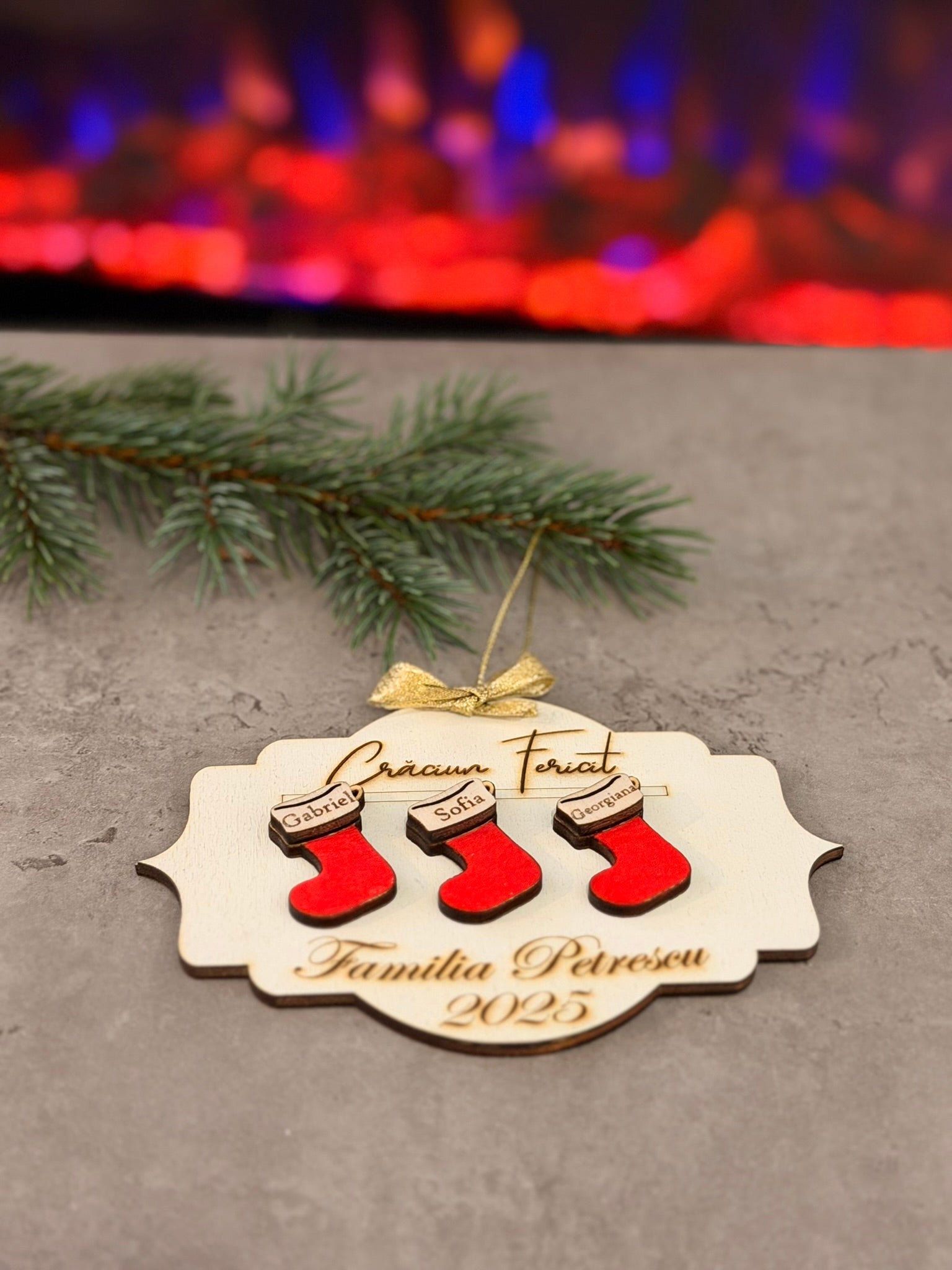 Adaugă un strop de magie bradului tău cu globul „Șosete de Familie”, realizat prin gravură și decupaj laser de înaltă precizie. Designul prezintă șosete atârnate în relief, simbol al căldurii și tradițiilor de sărbători.
