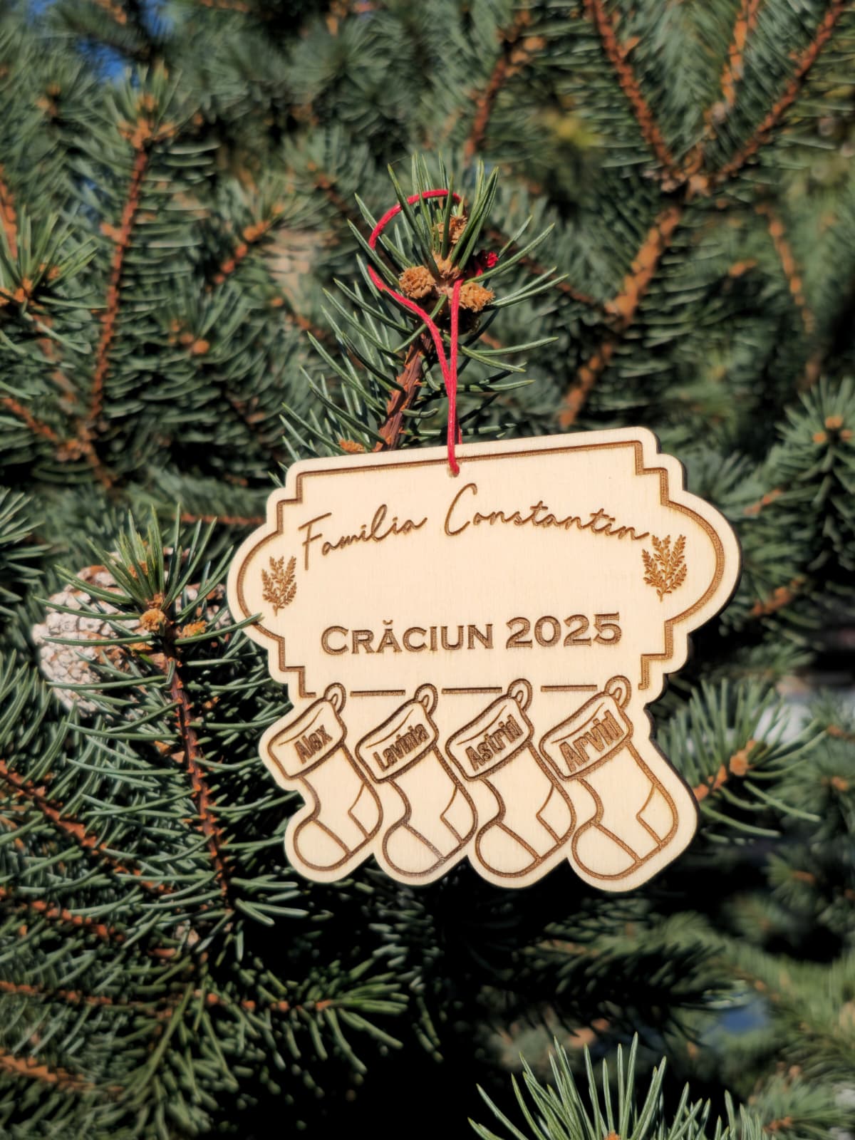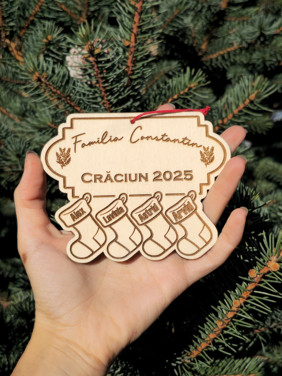 Celebrează spiritul sărbătorilor cu acest glob personalizat cu șosete atârnate, pe care sunt gravate cu grijă numele membrilor familiei tale. Un ornament plin de farmec și emoție, realizat manual, ce transformă bradul într-o adevărată poveste de Crăciun.