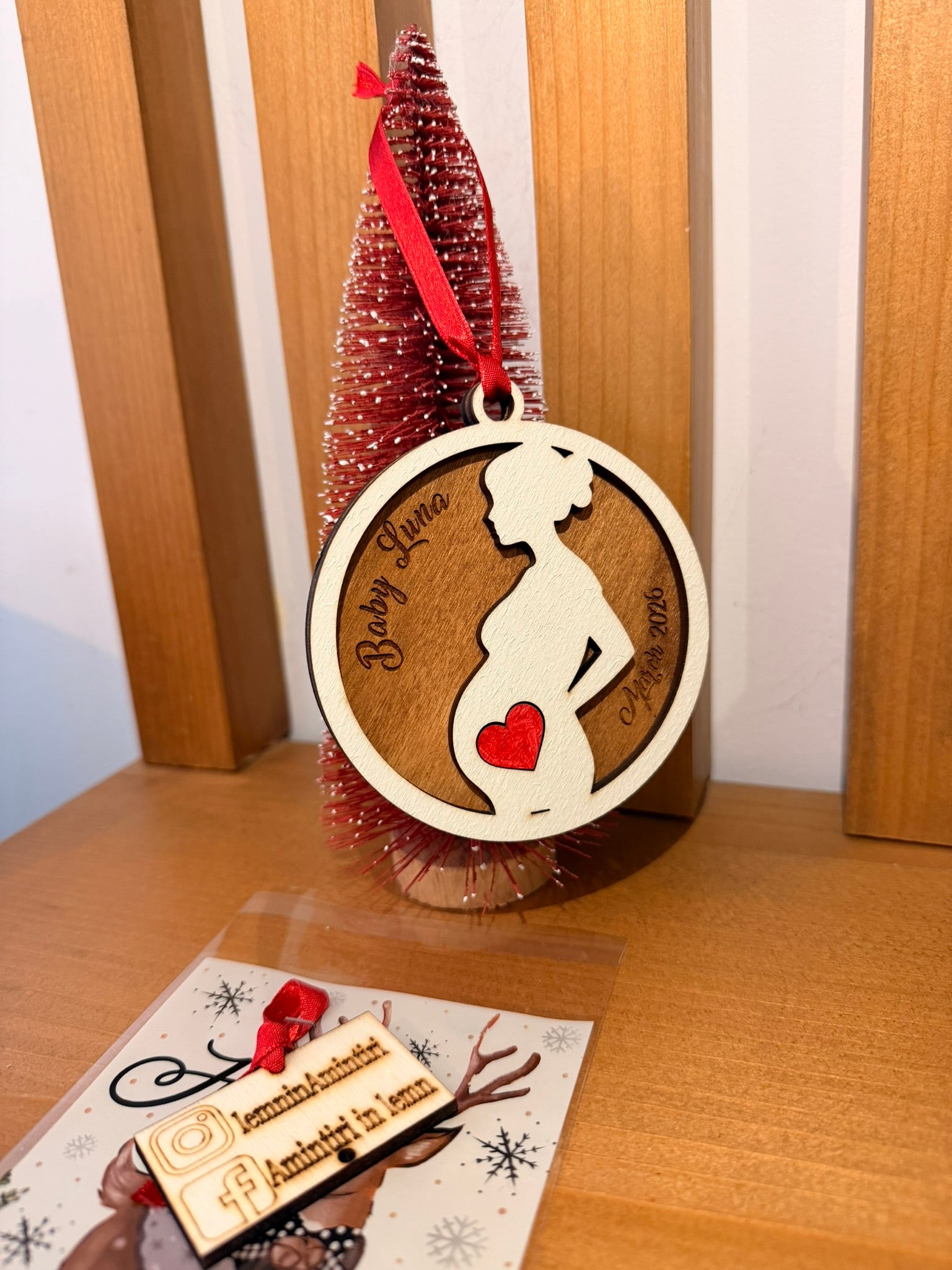 Acest glob cu siluetă de graviduță surprinde toată delicatețea și emoția perioadei în care o inimă bate pentru două. Ornamentul marchează cu blândețe un capitol plin de speranță și bucurie, transformând așteptarea în cea mai frumoasă amintire de pus în brad.