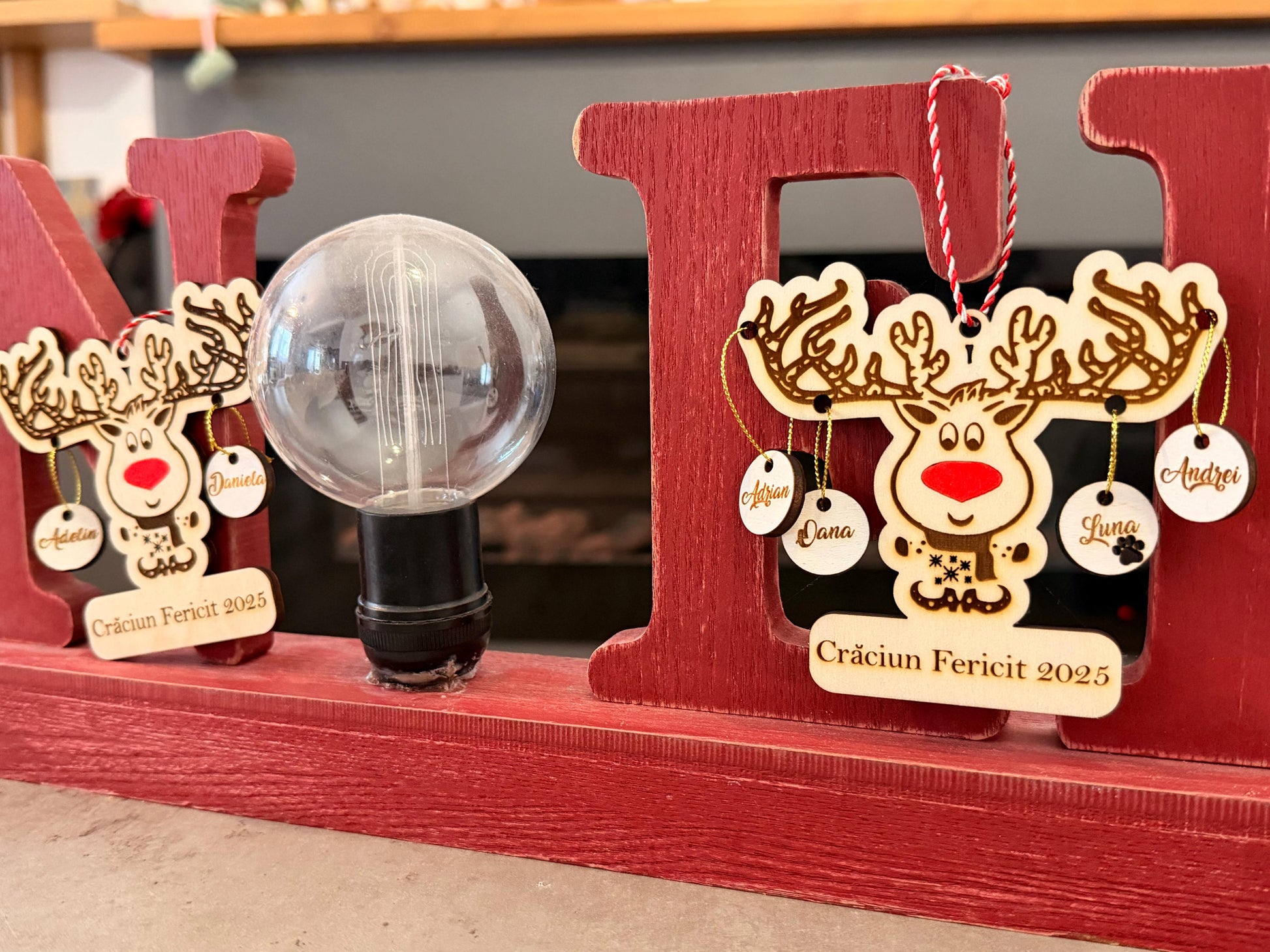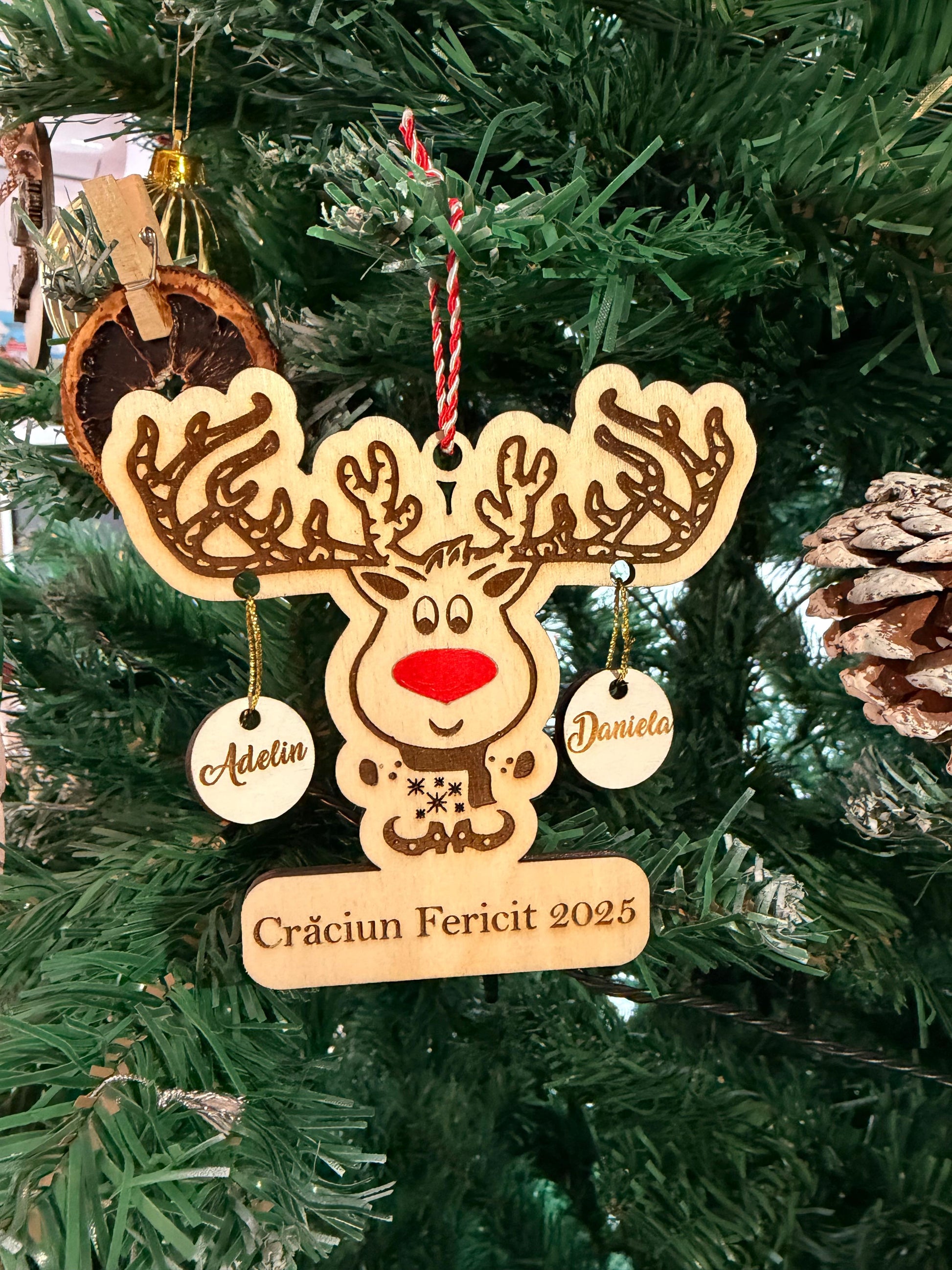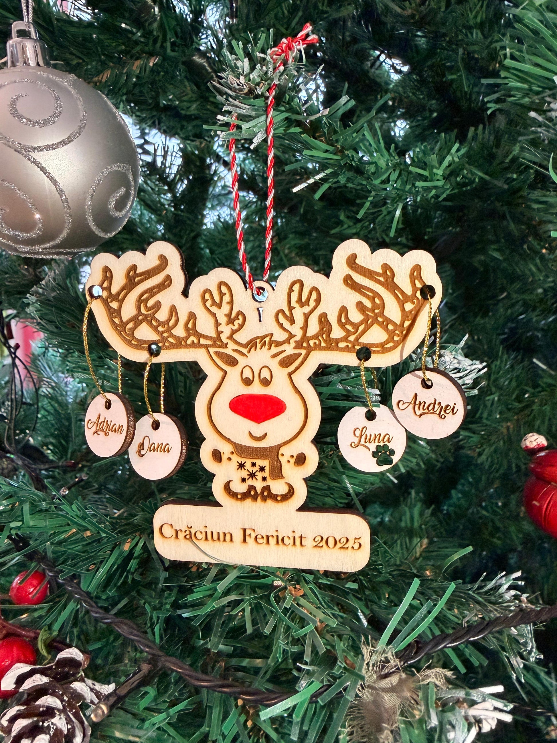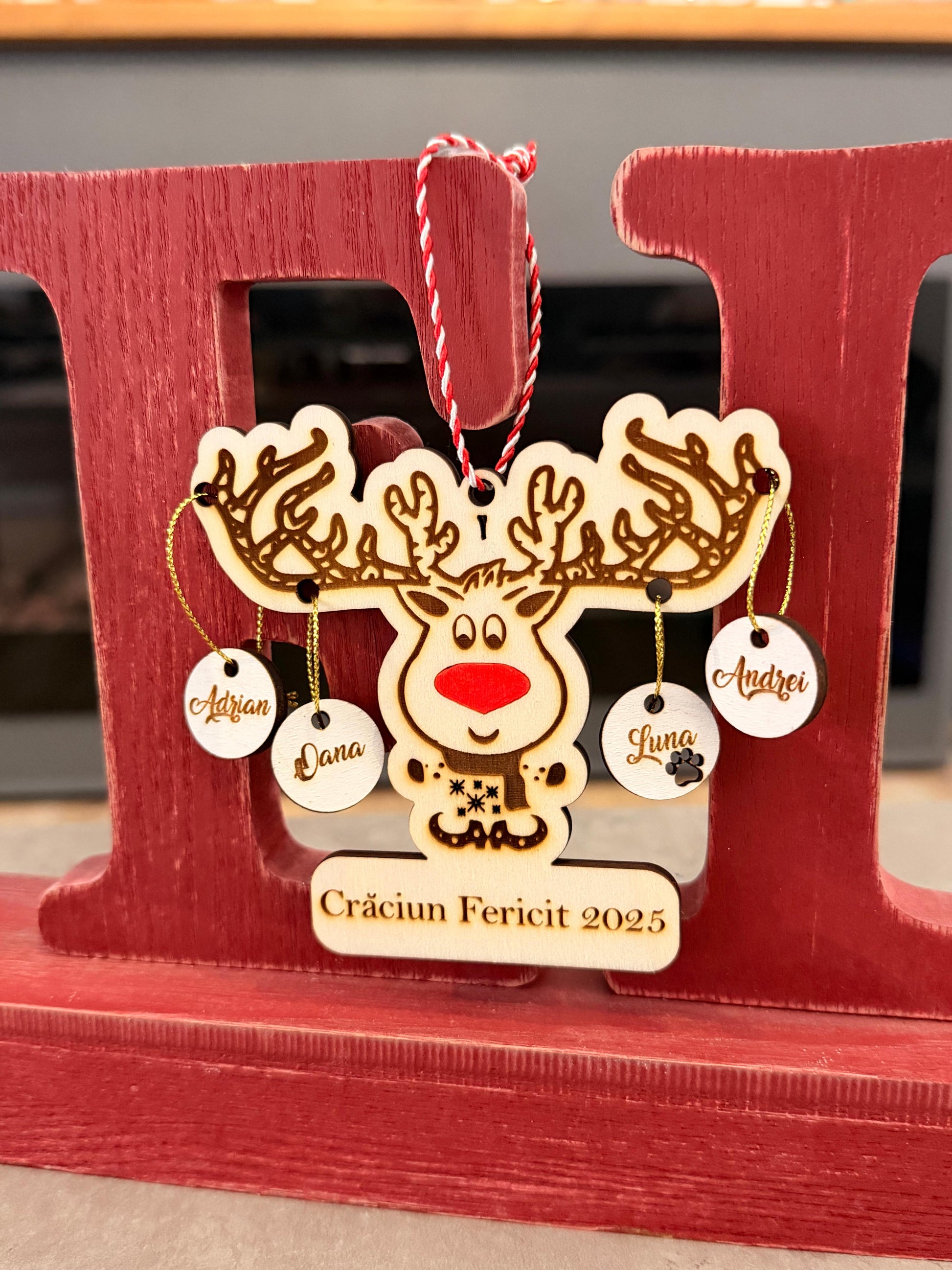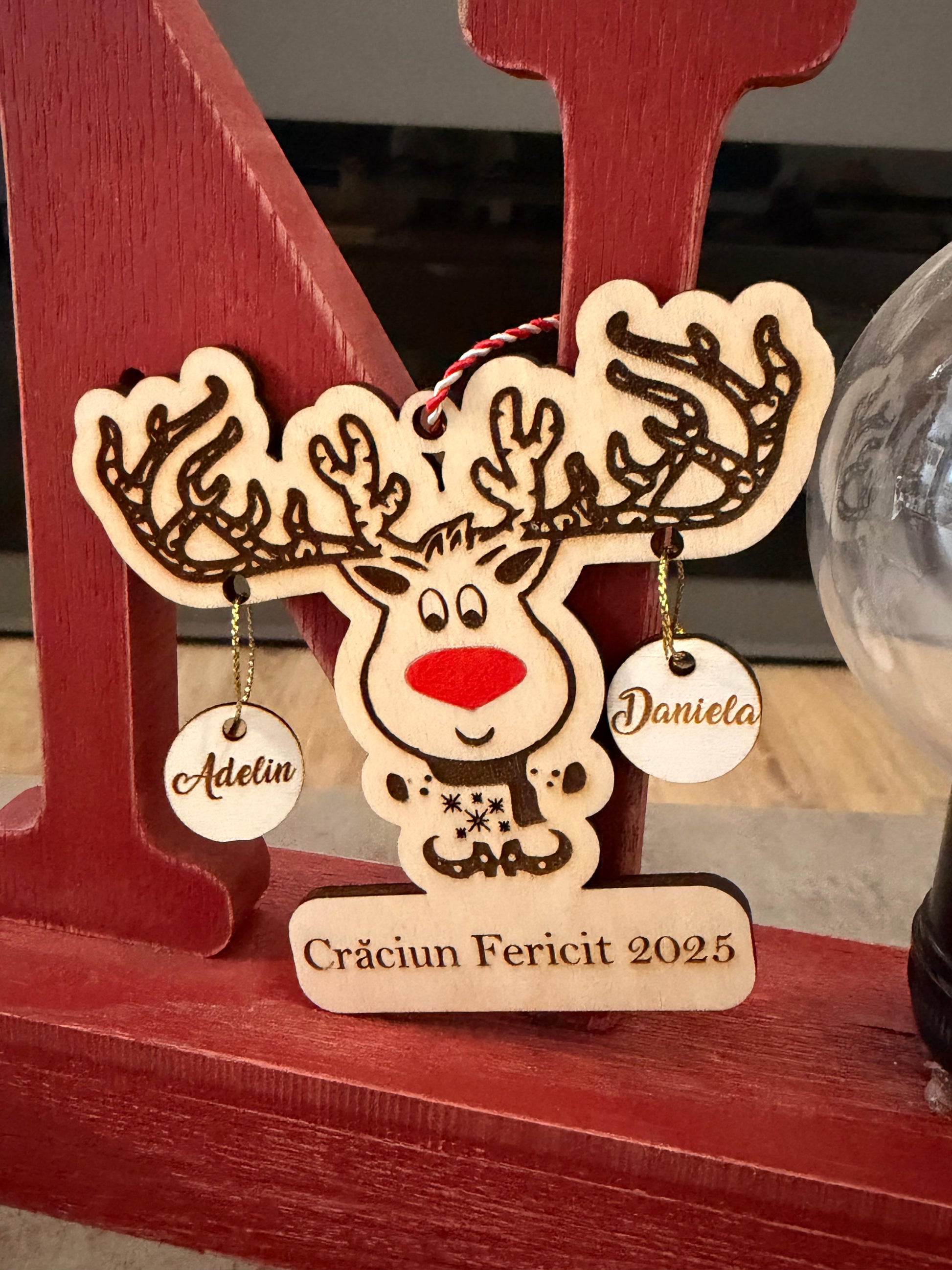 Glob decorativ în formă de ren, prevăzut cu globulețe personalizate cu numele dorite. Ideal pentru a reprezenta membrii familiei, acest ornament de Crăciun adaugă un plus de căldură și personalitate bradului. Un cadou special pentru familie, creat cu atenție la detalii.