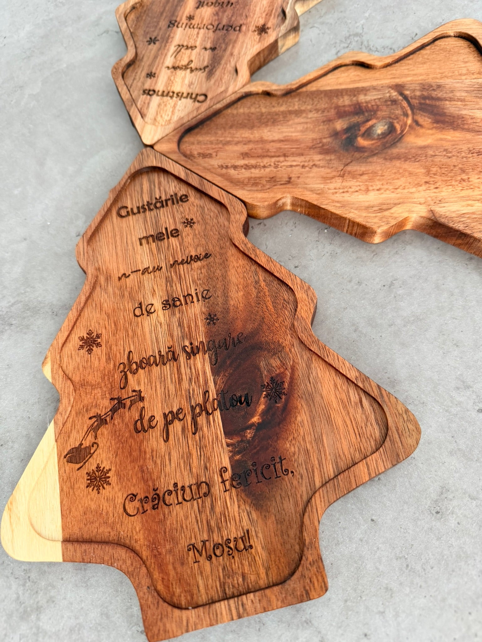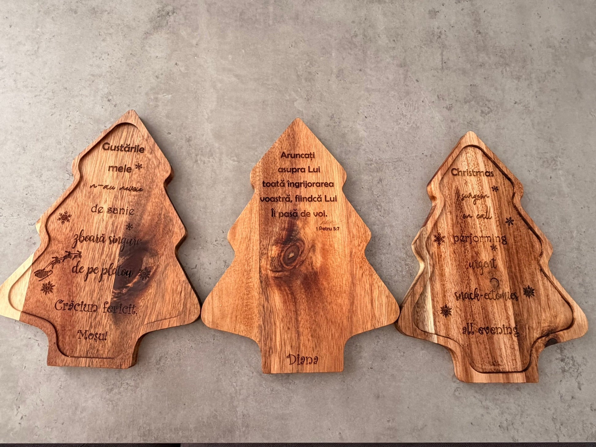 Transformă masa de sărbători într-un moment memorabil cu un platou în formă de brad, personalizat cu mesajul dorit. Perfect ca dar de Crăciun pentru familie, prieteni sau parteneri, acest platou adaugă un plus de căldură și originalitate fiecărei mese festive.